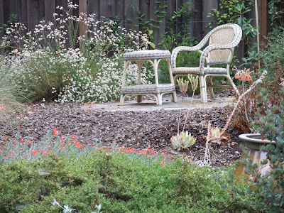 Moving in a little closer, we can see Epilobium canum (California fuchsia), enlivening the front garden with hummingbirds. And to the left of the table, Eriogonum fasciculatum, the local narrow-leaf buckwheat. Considering I pretty much don't water the front at all, that's not a bad display.